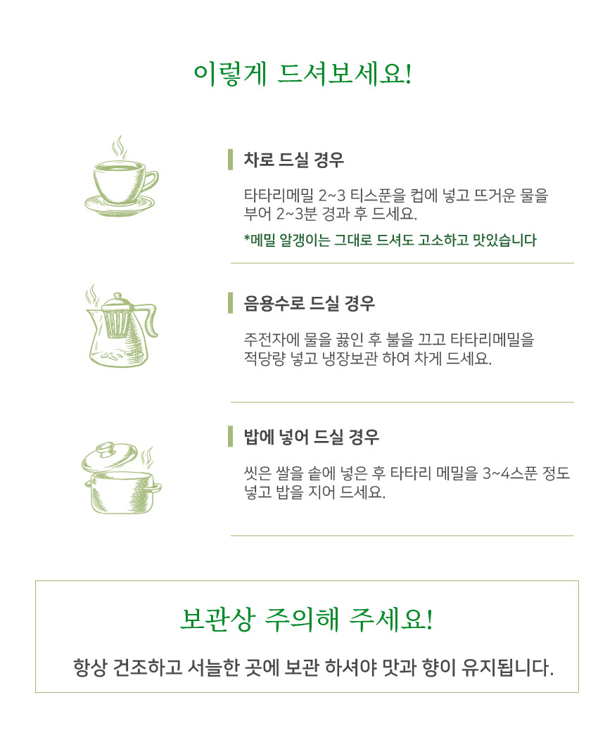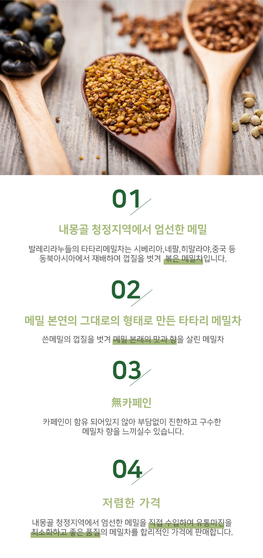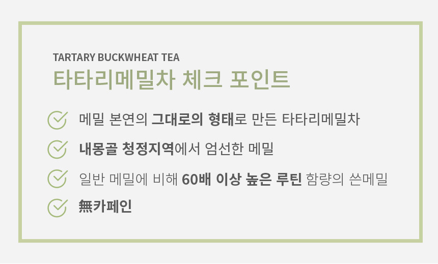 쓴메밀의 껍질을 벗겨 메밀 본래의 맛과 향을 살린 메밀차